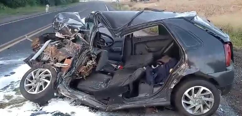 O veículo Gol, que seguia no sentido Pérola à Pranchita, colidiu frontalmente com o caminhão que vinha no sentido contrário, no final da terceira faixa da rodovia.