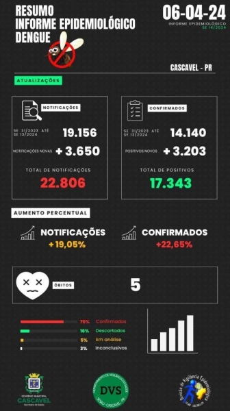 Além disso, no período de 30/07/2023 a 06/04/2024, referente a semana epidemiológica 14/2024, 17.343 casos de dengue e seis de febre chikungunya foram confirmados em Cascavel, conforme informações do Boletim Epidemiológico.