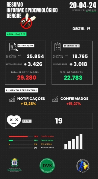 Nesta quinta-feira (25) a Secretaria de Saúde confirmou mais sete mortes por dengue em Cascavel, totalizando 19 óbitos pela doença no município.
