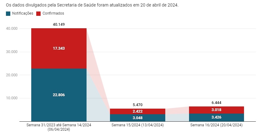 Em termos de casos confirmados, o aumento é ainda mais acentuado. Até a semana 15 de 2024, haviam sido confirmados 19.765 casos, enquanto na semana 16 foram adicionados mais 3.018 casos, totalizando 22.783 confirmações, o que representa um aumento de 15,27% em comparação com o total acumulado até a semana anterior.