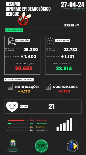 Duas novas mortes em decorrência de dengue foram confirmadas pela Secretaria de Saúde (SESAU) de Cascavel, no oeste do Paraná. Os dados foram divulgados na manhã desta sexta-feira (3).