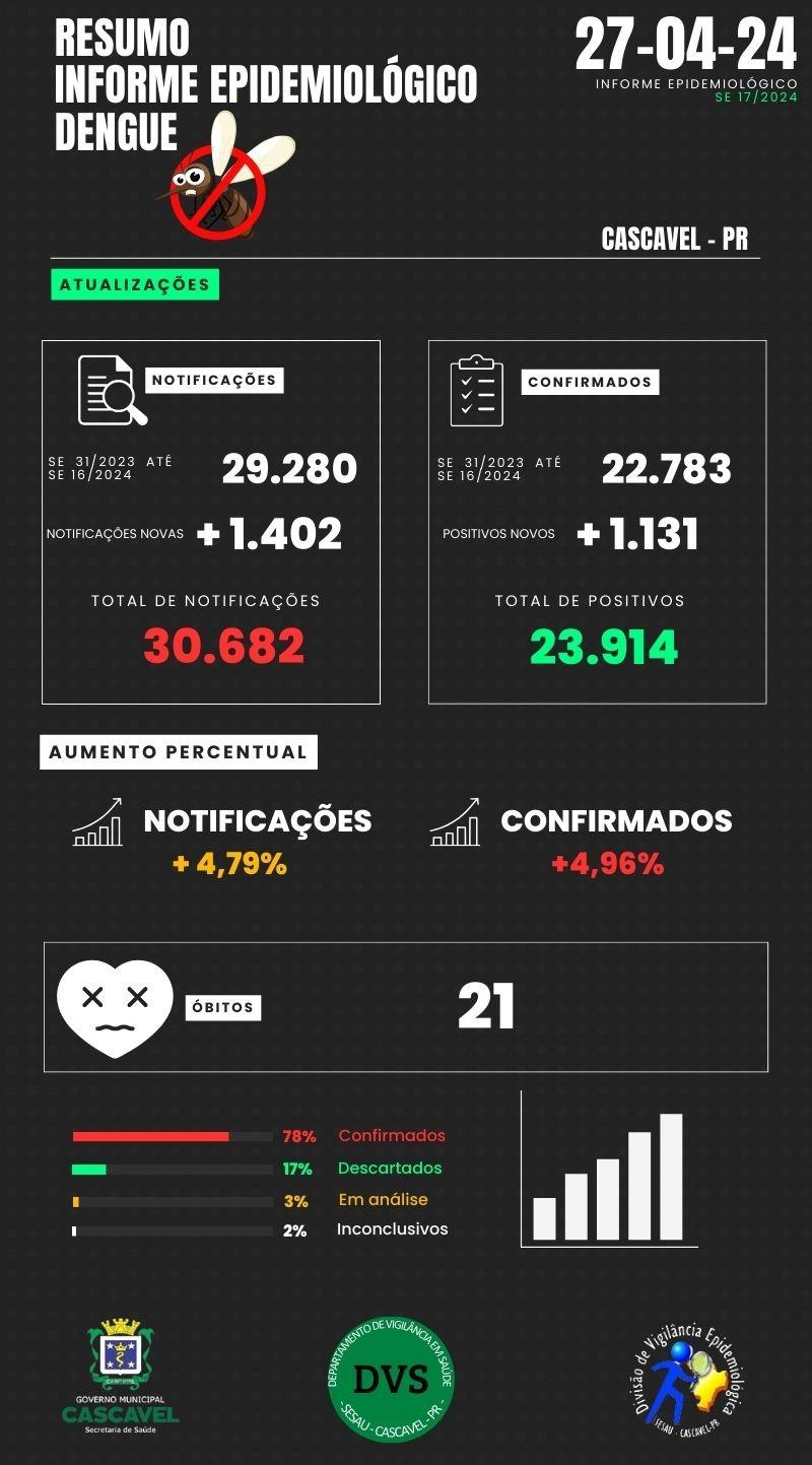 Ao todo, são 21 óbitos. O último informe mostra que o município tem 1.131 novos casos da doença, totalizando 23,9 mil.