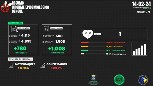 A cidade de Cascavel tem 4.895 notificações da doença, sendo que 1.508 casos foram confirmados. Desde a última semana, houve crescimento de 201,6% no número de confirmações.
