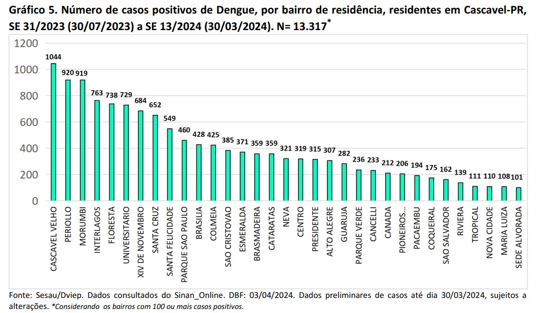 Os bairros com maiores números de casos confirmados são: Cascavel Velho (1.044), Periolo (920) e Morumbi (919).