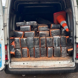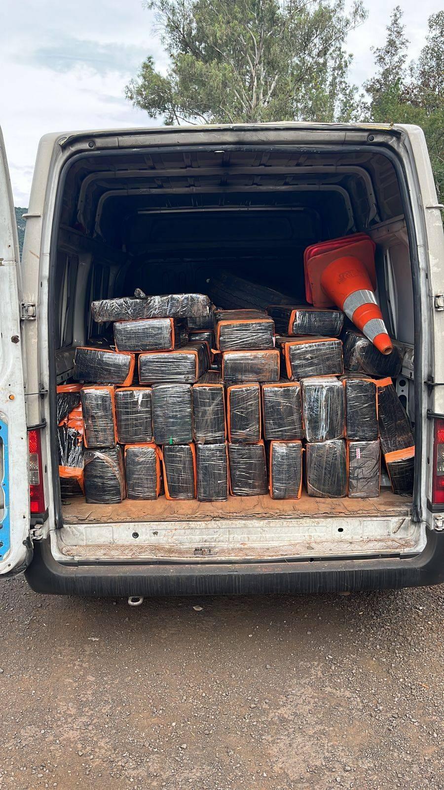 O veículo foi então abordado. O motorista e o passageiro estavam vestindo fardamentos falsos. Houve a constatação de que o furgão tinha placas clonadas e transportava vários fardos de maconha na parte interna. O carregamento pesou 1.481 quilos.
