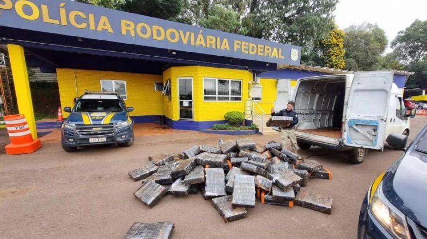 Quase 1,5 tonelada de maconha foi apreendida pela Polícia Rodoviária Federal em uma falsa viatura do Exército Brasileiro na cidade de Muçum no Rio Grande do Sul. A droga foi avaliada em R$ 3 milhões. Dois traficantes paranaenses foram presos em flagrante na ação realizada na tarde dessa terça-feira.