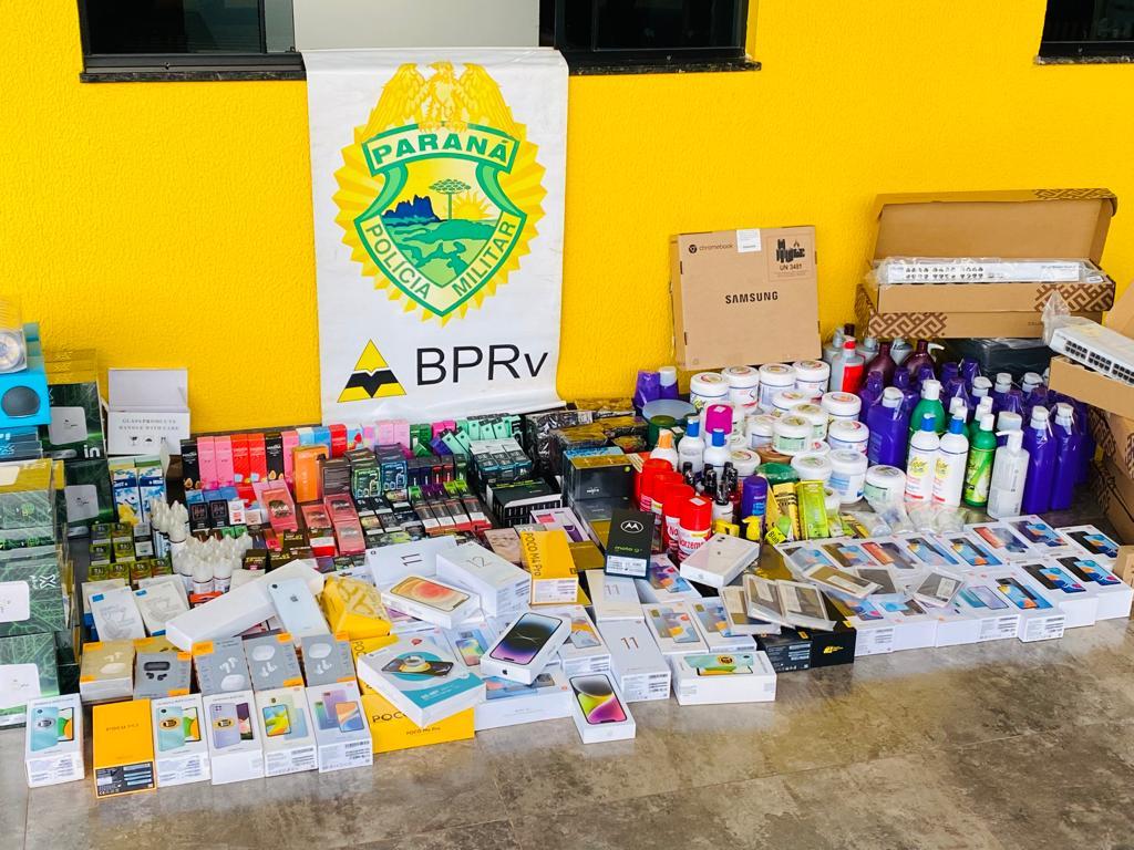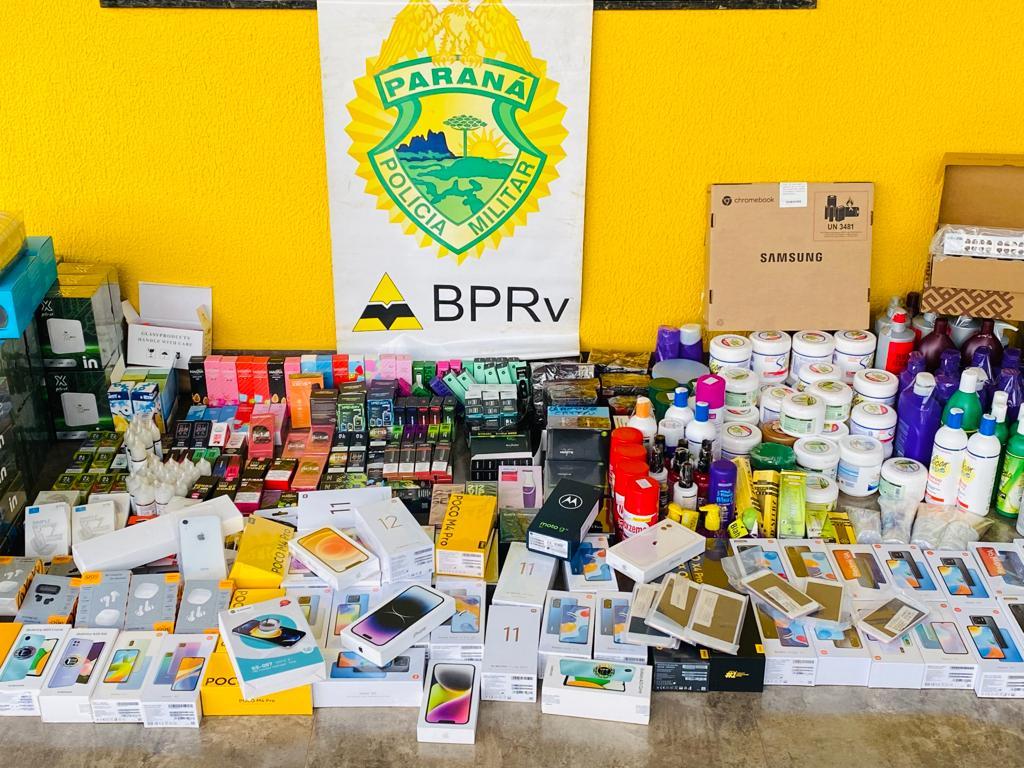 Durante patrulhamento na PR-317 no município de Toledo foi abordado um veículo GM/ Corsa com dois ocupantes, onde foi encontrado no bagageiro e sobre os bancos traseiros grande quantidade de celulares de marcas variadas como smartphones, iPhone, Chromebook, Alexas, cigarros eletrônicos, perfumes, produtos de beleza e higiene entre outros totalizando em torno de R$ 100 mil reais em produtos.