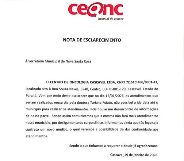 A Secretaria de Saúde de Nova Santa Rosa divulgou esclarecimentos oficiais sobre a não realização de atendimentos oncológicos previstos para a última quinta-feira (15).