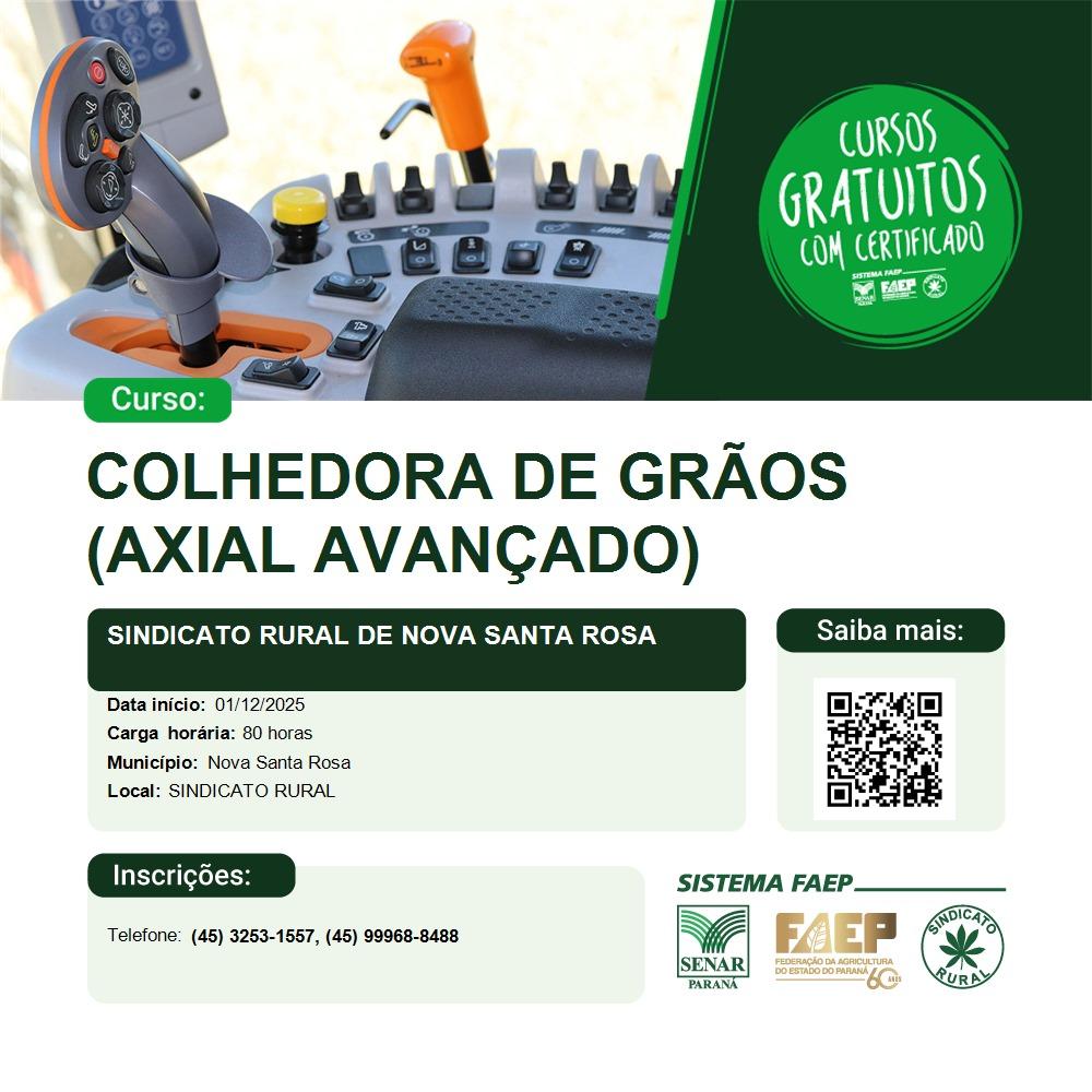 O Sindicato Rural está trazendo para o município um curso avançado e gratuito do SENAR-PR voltado a produtores e trabalhadores que utilizam colhedoras axiais ou desejam aprender a operar e manter esse tipo de máquina. A formação tem 80 horas de duração e oferece um conteúdo completo, desde conceitos técnicos até práticas de campo.