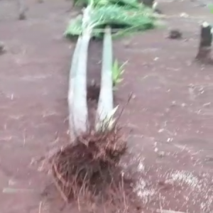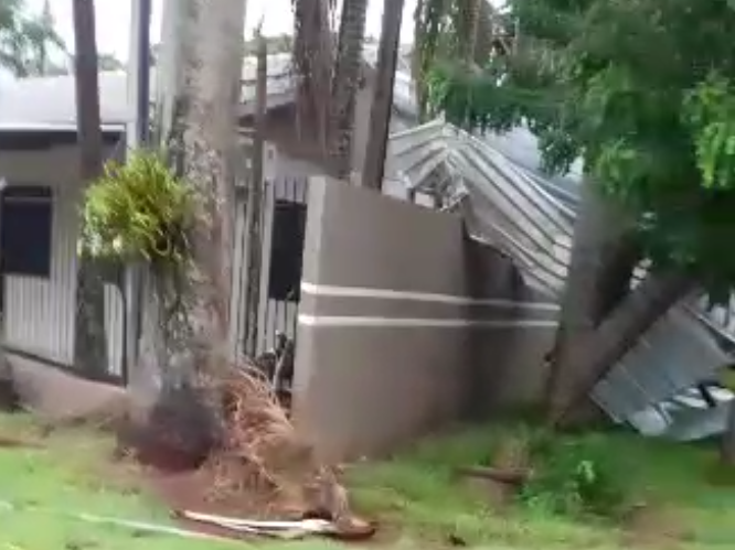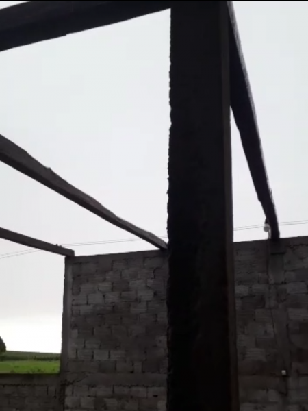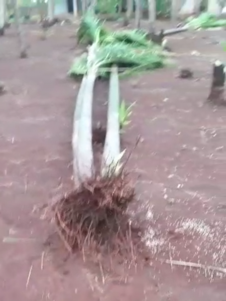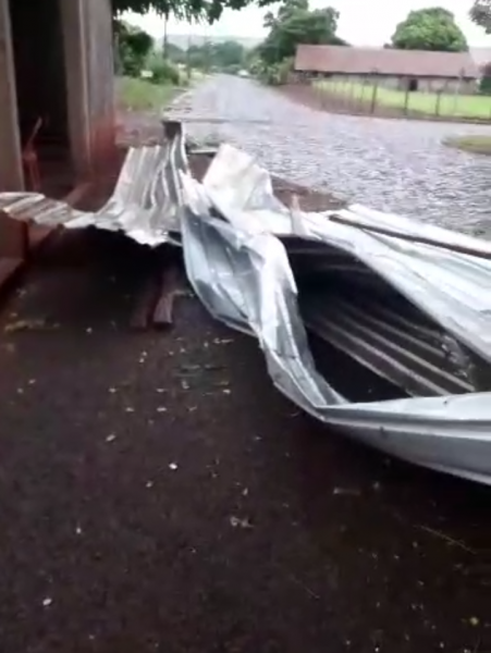 Rajadas de vento causaram destelhamento em um estabelecimento comercial. O telhado de aluzinco foi arrancado e atingiu a rede de alta tensão, que acabou se rompendo. Em outra residência, houve ainda queda de árvores de palmito.
