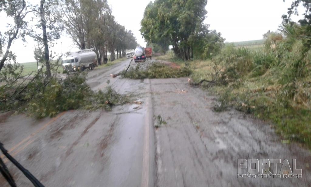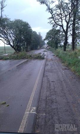 A chuva e o vento que atingiu Palotina e região quebrou diversos galhos na PR182 entre Palotina e Maripá.
