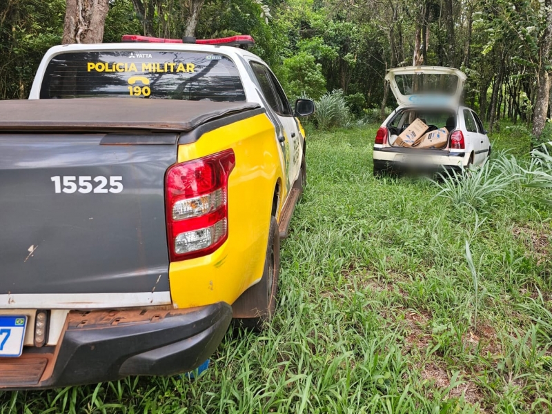 A equipe policial realizava patrulhamento em uma área de lazer daquela localidade, momento em que avistou o referido veículo parado atrás de um monte de galhos de árvores, abandonado e com as portas abertas. Dentro do carro haviam 200 pacotes de cigarros.