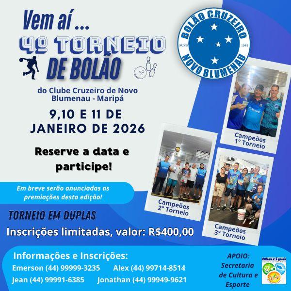 O Clube Cruzeiro, da comunidade de Novo Blumenau, em Maripá, promove nos dias 9, 10 e 11 de janeiro de 2026 o 4º Torneio de Bolão. O evento será realizado na cancha da Linha Novo Blumenau e deve reunir duplas de diferentes municípios da região.