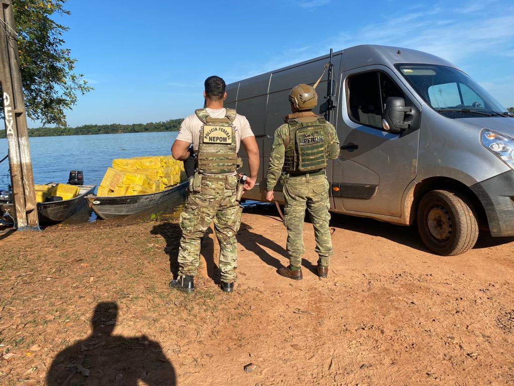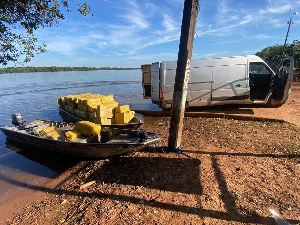 No local da abordagem, foram localizadas duas embarcações de metal, medindo aprox. 6 metros, ambas equipadas com motores Mercury 50 HP, um veículo, Renault/Master, além de aproximadamente 80 caixas de cigarros contrabandeados do Paraguai.