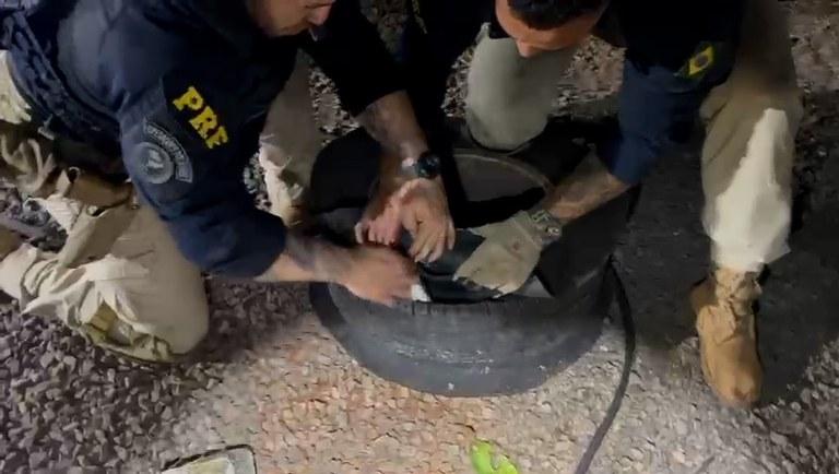 Com a suspeita, a PRF solicitou auxílio da Polícia Militar, que realizou inspeção detalhada com auxílio de cães farejadores. Os cães indicaram a presença de algum ilícito nos quatro pneus do veículo.