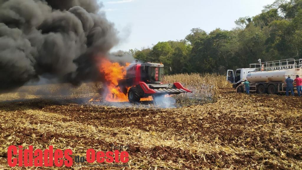 Uma colheitadeira pegou fogo quando estava colhendo milho em uma propriedade no interior de Missal, o incêndio ocorreu nesta segunda-feira.