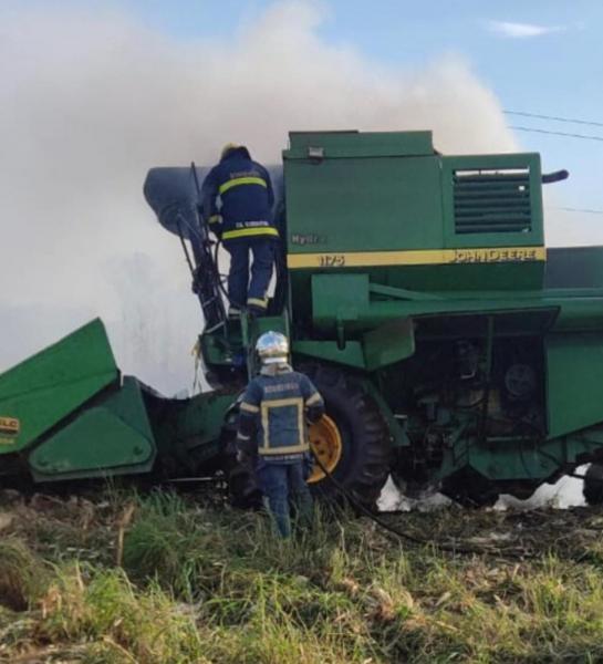 A rápida ação dos agricultores e do Corpo de Bombeiros impediu a completa destruição da colheitadeira John Deere.