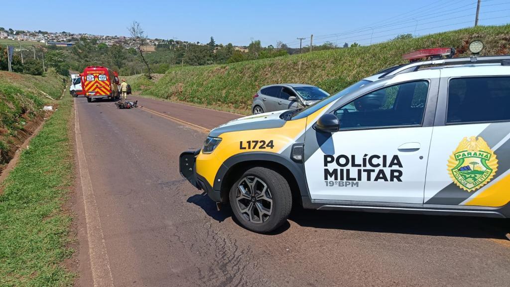 O acidente envolveu uma motocicleta Honda Biz 125, com placas de Toledo, conduzida por uma mulher, e um veículo Ford Focus com placas Mercosul.