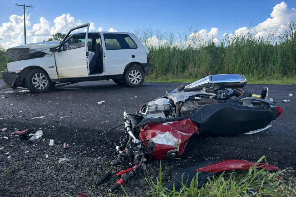 A batida envolveu um Fiat Uno Mille, com placas de Ampére, e uma motocicleta Honda CB 300, com placas de Realeza, embora o proprietário seja morador de Pinhal de São Bento.