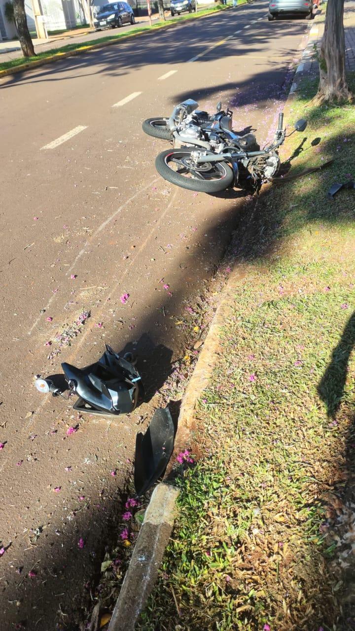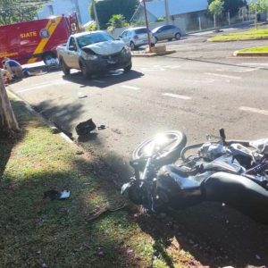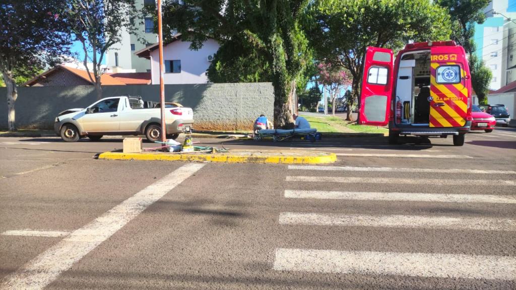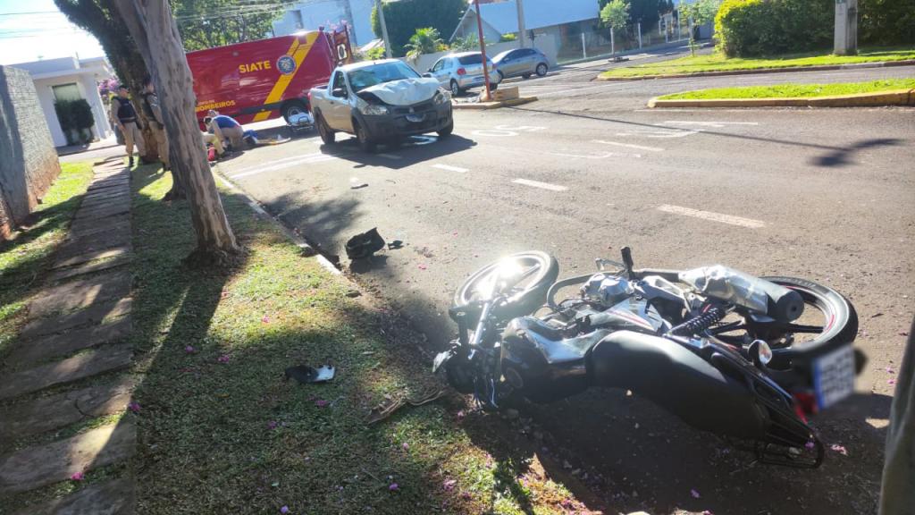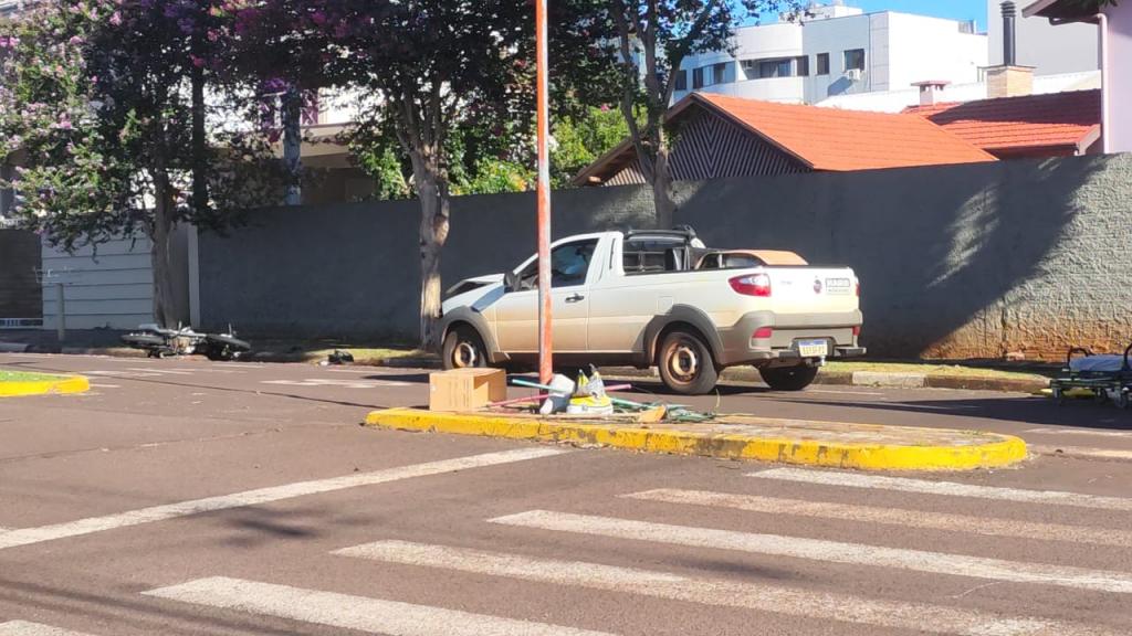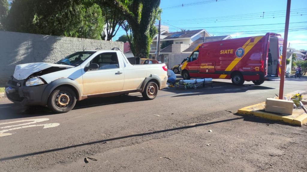 Uma colisão entre uma motocicleta e um Fiat Strada foi registrada na tarde de terça-feira (13), no cruzamento da Rua XV de Novembro com a Rua Crisciumal, no Jardim La Salle, em Toledo. O impacto chamou a atenção de moradores e motoristas que passavam pelo local.
