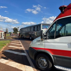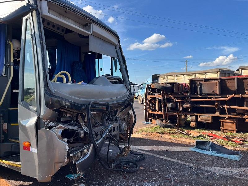 Com o impacto, o caminhão tombou e ficou de lado, enquanto o ônibus permaneceu parado na pista. O trânsito precisou ser desviado pelas laterais do trevo, gerando grande movimentação na região.