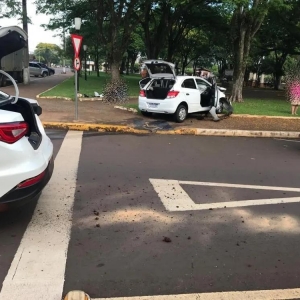 Corpo de Bombeiros e Policia Militar foram acionados na manhã desta quinta-feira (02) para o registro de um acidente de trânsito no cruzamento das ruas Men de Sá e Paraná, esquina da Igreja Católica de Marechal Cândido Rondon.