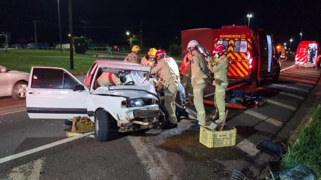 Um grave acidente foi registrado na madrugada deste domingo (1º) na rodovia BR-277, no trecho do trevo do Guarujá, em Cascavel. A colisão frontal envolveu um VW Voyage com placa preta, de colecionador, e um Hyundai IX35.