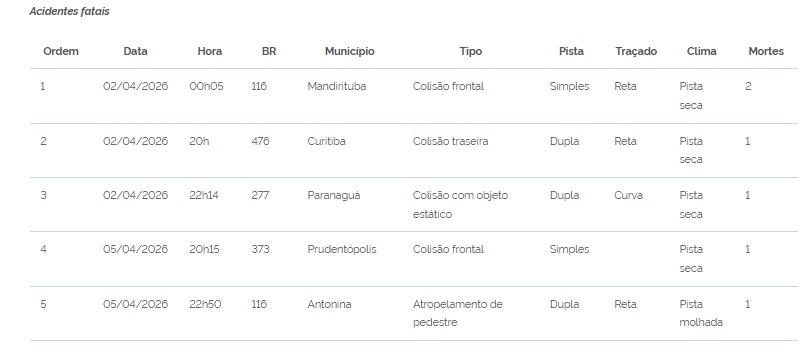 A Polícia Rodoviária Federal (PRF) registrou 112 acidentes, 106 pessoas feridas e seis mortes durante a operação Semana Santa 2026 nas rodovias federais do Paraná, realizada entre os dias 2 a 5 de abril. No feriado do ano passado, foram registrados 110 acidentes, 119 pessoas feridas e sete mortes. Na ocasião, a operação teve cinco dias e abarcou também o feriado de Tiradentes.