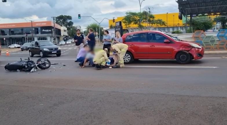 Um motociclista de 33 anos ficou ferido após se envolver em um acidente com um carro na tarde desta quinta-feira (19), na Região do Lago, em Cascavel.