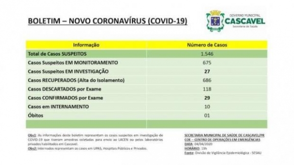 Quatro novos casos do novo coronavírus (Covid-19) foram confirmados em Cascavel, de acordo com o boletim divulgado neste sábado (04) pela Secretaria Municipal de Saúde. Com isso, o município contabiliza, até o momento, 29 casos confirmados e um óbito pela doença. Os novos pacientes diagnosticados são três mulheres e um homem, com idades entre 28 e 59 anos.