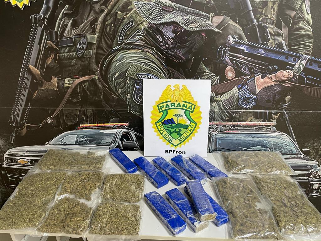 Durante a verificação, os policiais localizaram um casal com 9 tabletes de substância análoga a maconha, pesando 5,140 kg e 7 tabletes de substância análoga a capulho, pesando 1,920 kg.