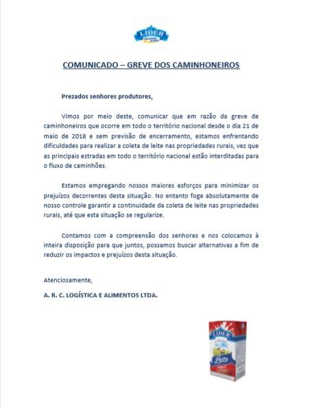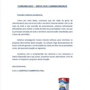 Vimos por meio deste, comunicar que em razão da greve de caminhoneiros que ocorre em todo o território nacional desde o dia 21 de maio de 2018 e sem previsão de encerramento, estamos enfrentando dificuldades para realizar a coleta de leite nas propriedades rurais, vez que as principais estradas em todo o território nacional estão interditadas para o fluxo de caminhões.