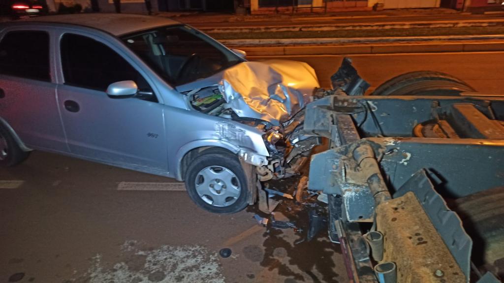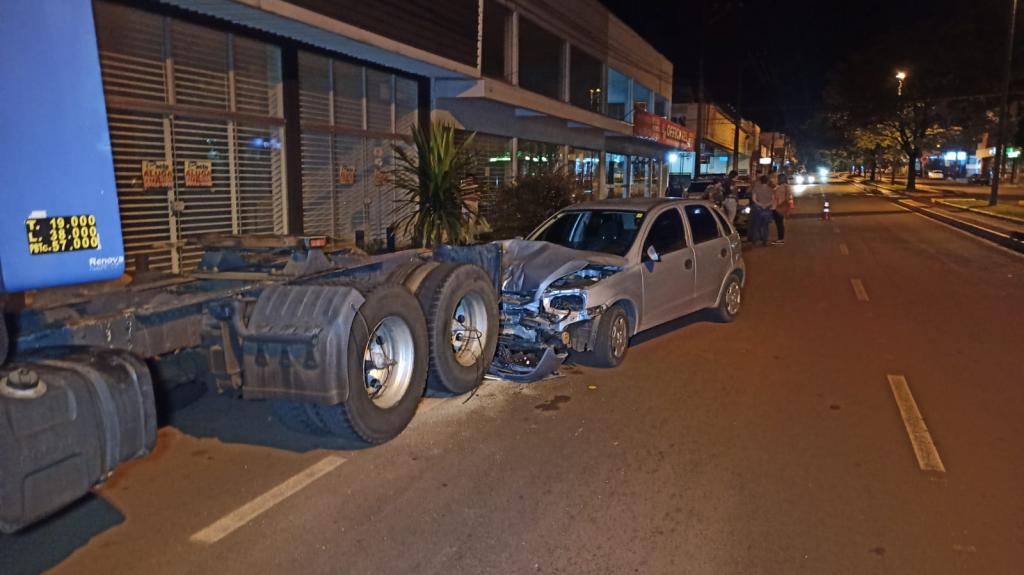O Corsa bateu atrás de um cavalo mecânico modelo Scania 360 na noite deste sábado, por volta das 22h30 30 na avenida Parigot de Souza no Jardim Porto Alegre em Toledo.