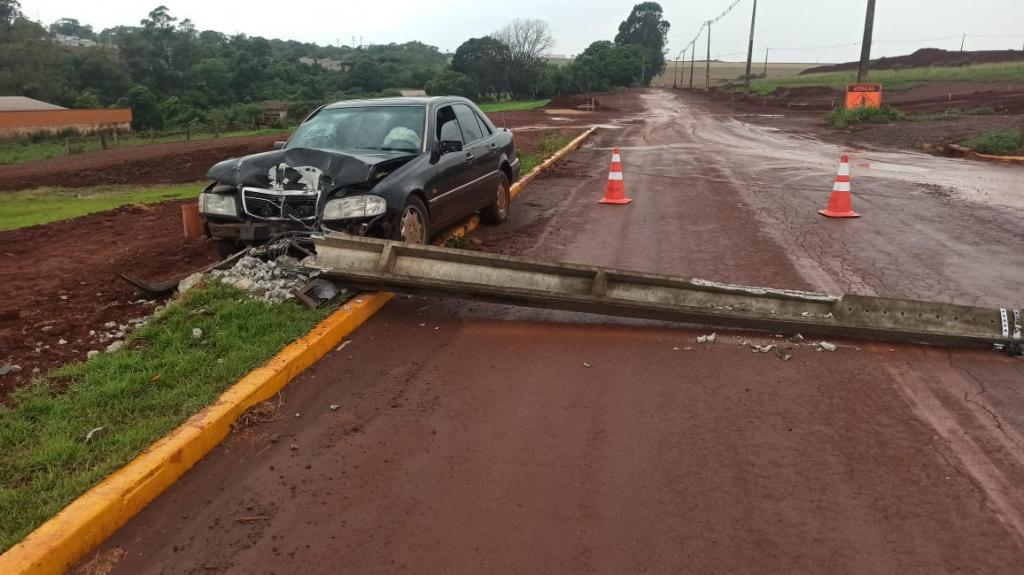 Um veículo Mercedes Benz C280 bateu contra um poste de energia, no bairro Jardim da Mata, em Toledo.