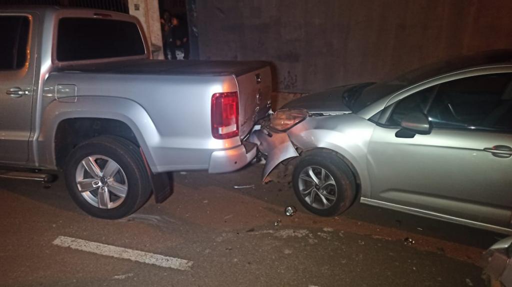 Para não bater com a moto ele puxou a direção para o lado direito e atingiu um veículo Citroen C3 com placas Mercosul que estava estacionado e em seguida o Citroen foi jogado contra traseira de uma caminhonete Amarok com placas também do Mercosul que estava estacionada na frente.