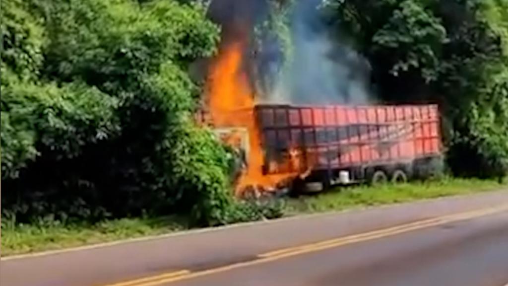 Um caminhão boiadeiro pegou fogo às margens da PR-180, em Boa Vista da Aparecida, no Oeste do Paraná, na manhã desta terça-feira (19). O acidente aconteceu às margens da rodovia, próximo ao trevo que dá acesso a Três Barras do Paraná.