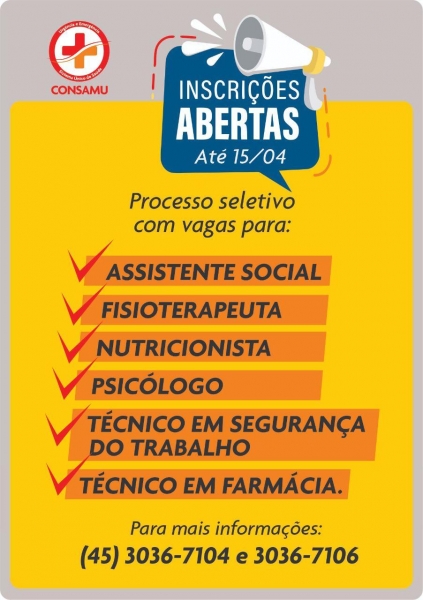 As inscrições para o Processo Seletivo Simplificado (PSS) do Consórcio de Saúde dos Municípios do Oeste do Paraná – CONSAMU encerram nesta quarta-feira (15).