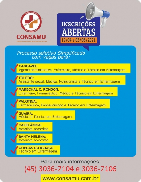 Continuam abertas as inscrições para o Processo Seletivo Simplificado (PSS) do Consórcio de Saúde dos Municípios do Oeste do Paraná – CONSAMU.