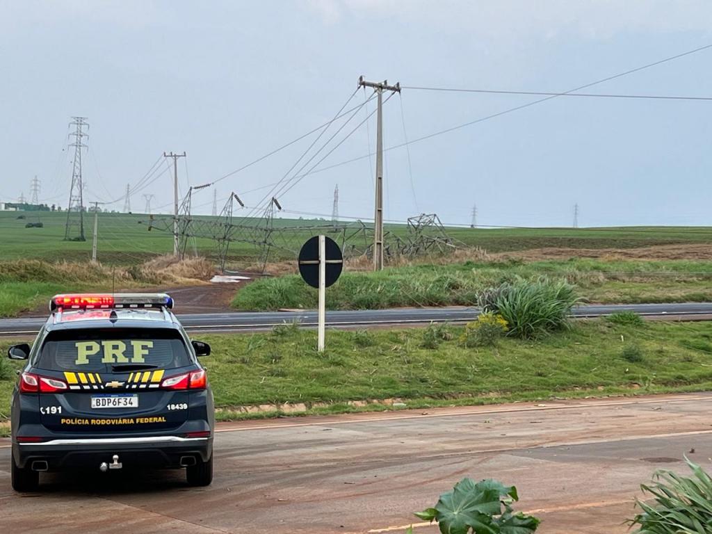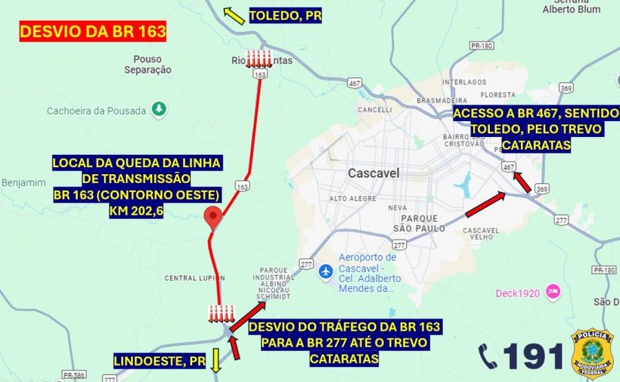 A Polícia Rodoviária Federal (PRF) informa que o Contorno Oeste, em Cascavel, está interditado devido à queda de uma torre de energia elétrica às margens da BR-163, no km 202. A fiação está ocupando toda a pista, que precisou ter o trânsito totalmente interrompido.