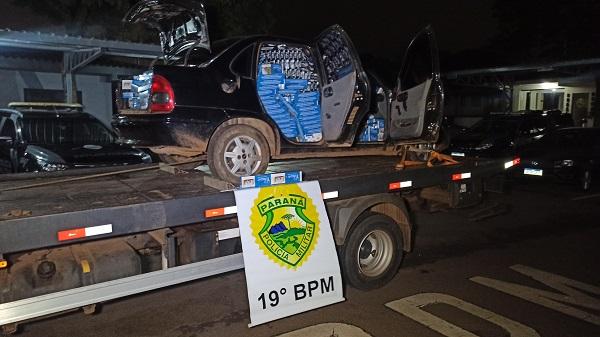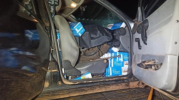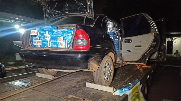 No carro foram localizados 28 caixas de cigarros contrabandeados.
