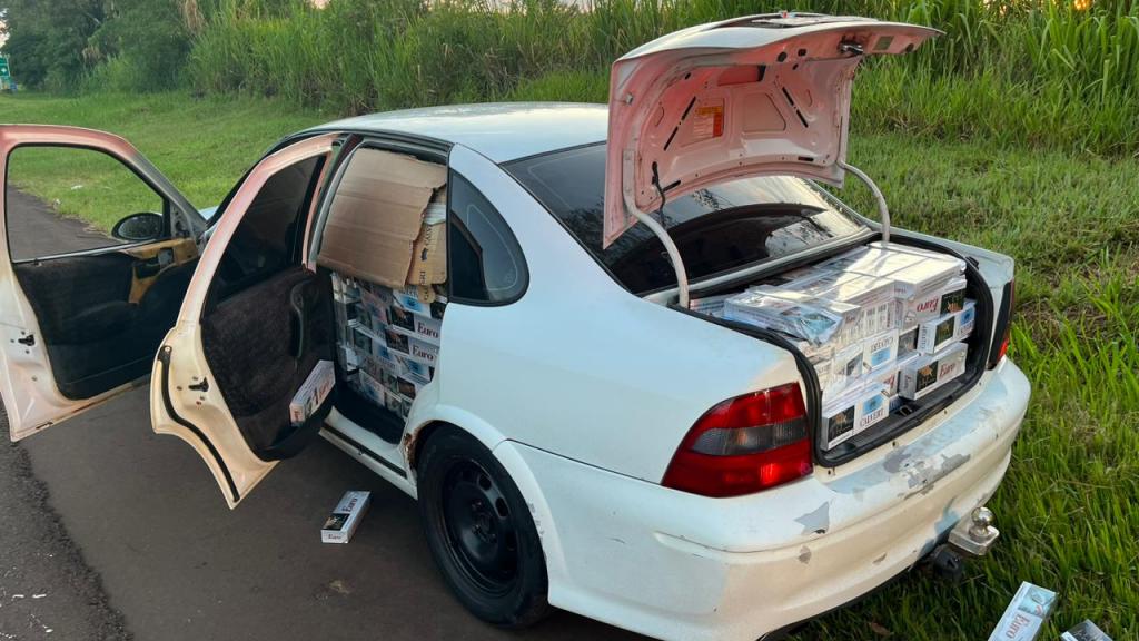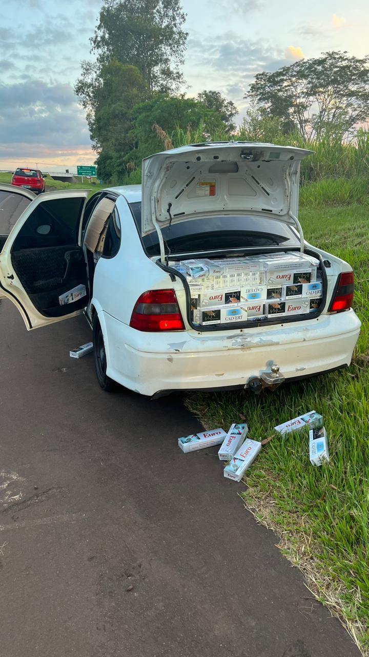 De imediato a equipe fez o retorno na tentativa de abordagem com giroflex, sirene e sinais luminosos, porém o condutor desobedeceu ordem de parada e empreendeu fuga realizando manobras de ultrapassagem em local proibido, forçando passagem entre os veículos por aproximadamente dez quilômetros, quando foi realizada a abordagem, onde constatou ser um veículo GM/Vectra, ostentando placas de Goiânia-GO, o qual era conduzido por um homem de 41 anos, morador de Ribeirão Preto-SP, após buscas no interior do veículo foi localizado em seu interior e porta-malas aproximadamente 1.250 (um mil duzentos e cinquenta) pacotes de cigarros contrabandeados do Paraguai das marcas Calvert e Euro, conforme relato do próprio condutor.