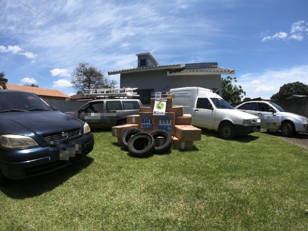 Outros dois indivíduos se encontravam no local. Eles foram abordados e em busca pessoal nada de ilícito foi encontrado, já em busca veicular foi verificado que nos veículos GM/Ipanema e Fiat/Fiorino possuíam rádio VHF instalado em seus painéis. Na residência em frente ao local onde encontravam-se os indivíduos foram localizados 3 pneus de procedência estrangeira, aproximadamente 23 caixas e outros 06 maços de cigarros contrabandeados do Paraguai.