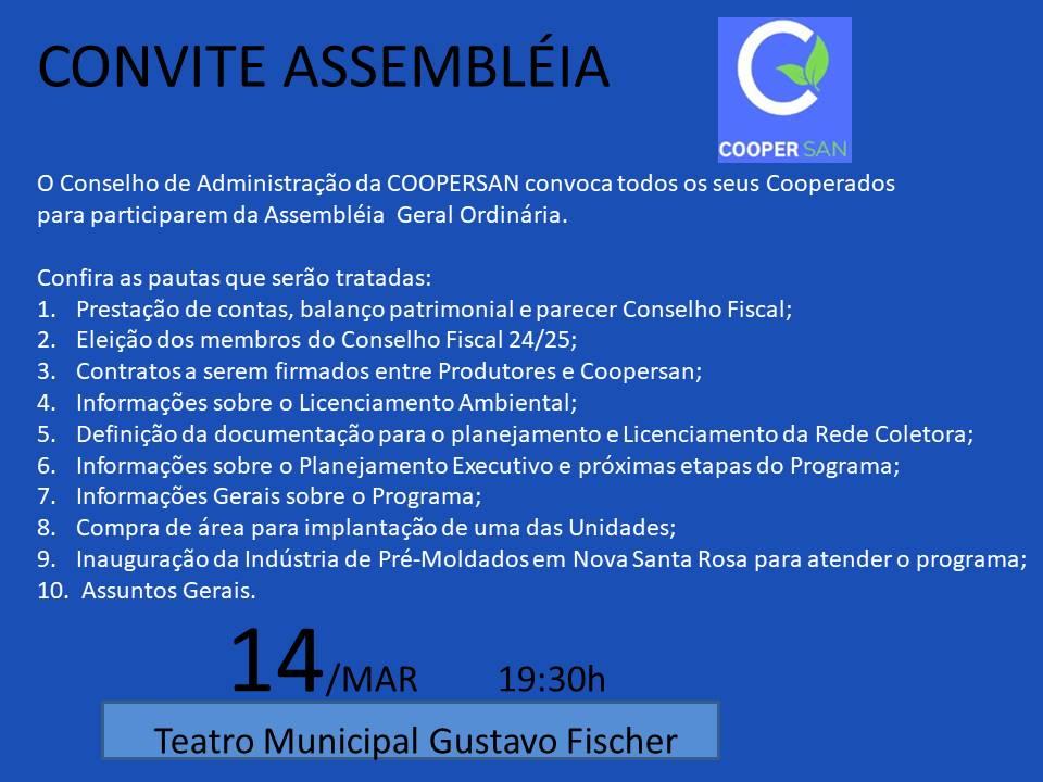 O Conselho de Administração da COOPERSAN convoca todos os seus Cooperados para participarem da Assembleia Geral Ordinária.