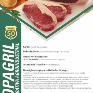 A Copagril Cooperativa Agroindustrial, abre oportunidade de emprego para o cargo de auxiliar de açougue na unidade do Supermercado Copagril da avenida Maripá em Marechal Rondon, jornada de trabalho de 44 horas semanais.