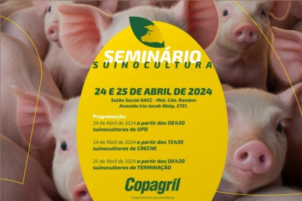 A Cooperativa Agroindustrial Copagril realizará, nos dias 24 e 25 de abril, o evento: Seminário de Suinocultura 2024, que terá por local o Salão Social da Associação Atlética Cultural Copagril (AACC), em Marechal Cândido Rondon.