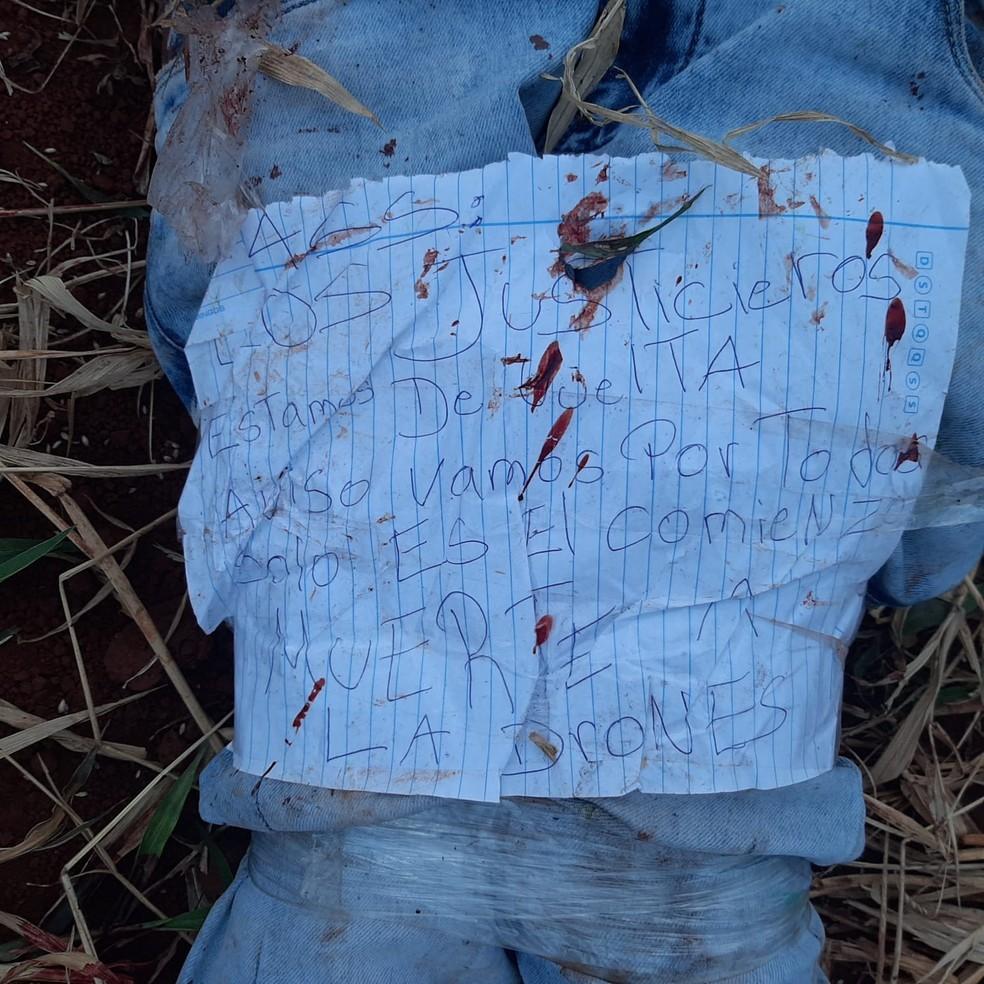 O corpo de um adolescente de 17 anos, foi encontrado na manhã desta quarta-feira (28) na cidade de Pedro Juan Caballero, no Paraguai, vizinha a Ponta Porã (MS). Um bilhete parecido com o que foi encontrado após a execução do casal na noite de segunda-feira (26) foi encontrado junto ao corpo da vítima.