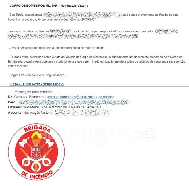 O e-mail foi enviado para algumas empresas com informações sobre “vistoria do Corpo de Bombeiros nas instalações” e citando que a vistoria seria feita após “denúncias anônimas” (veja os detalhes nas imagens).