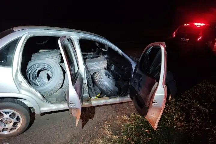 Um automóvel Corsa Classic que estava carregado com 40 pneus possivelmente de origem estrangeira foi encontrado pela Polícia Militar (PM) abandonado na zona rural de Francisco Alves, na noite desta quarta-feira (2). O veículo foi localizado após uma denúncia de possível atividade dos “piratas do asfalto”.