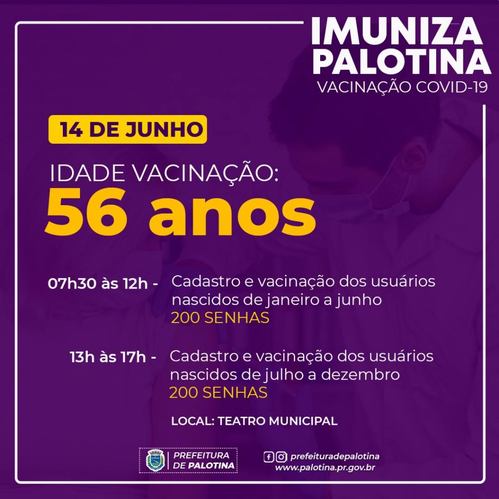 A Secretaria Municipal de Saúde de Palotina informa que na próxima segunda-feira (14), vai iniciar a vacinação para pessoas com 56 anos de idade.