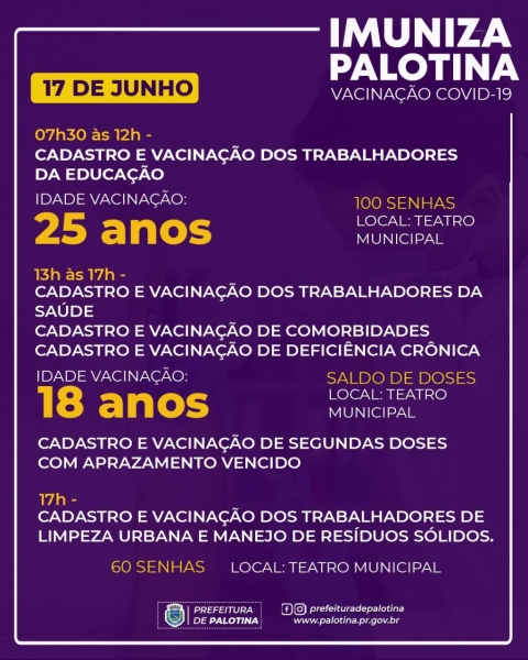 A Secretaria Municipal de Saúde de Palotina informa que nesta quinta-feira (17), das 07h30 às 12h00, a equipe de vacinação estará imunizando 100 profissionais do setor de Educação do município. Na parte da tarde das 13h00 às 17h00 serão vacinados os profissionais do setor de saúde, pessoas com comorbidades e pacientes com deficiências crônicas acima de 18 anos de idade.